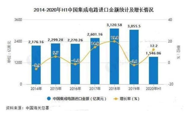 根据海关的数据, 2020上半年,中国进口芯片多达2423亿个,累计增长25.5%,而进口金额为1546亿美元,累计增长12.2%。