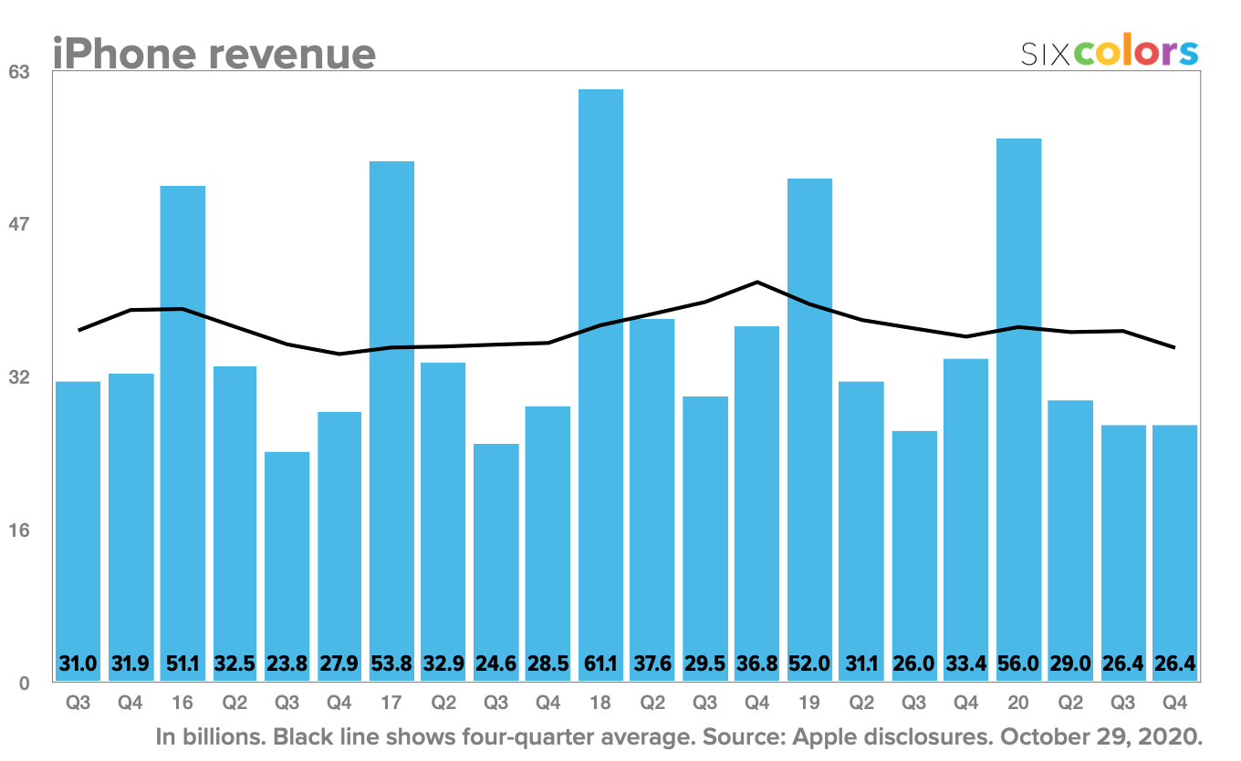 这里小雷要做个辟谣,在先前各大媒体中口口相传的“iPhone营收较去年暴跌”却为事实,但他们没有考虑到时期问题。由于iPhone 12的延期,苹果的Q4财报并没有统计到iPhone 12发售的10月份,而是以7—9月份为统计周期。