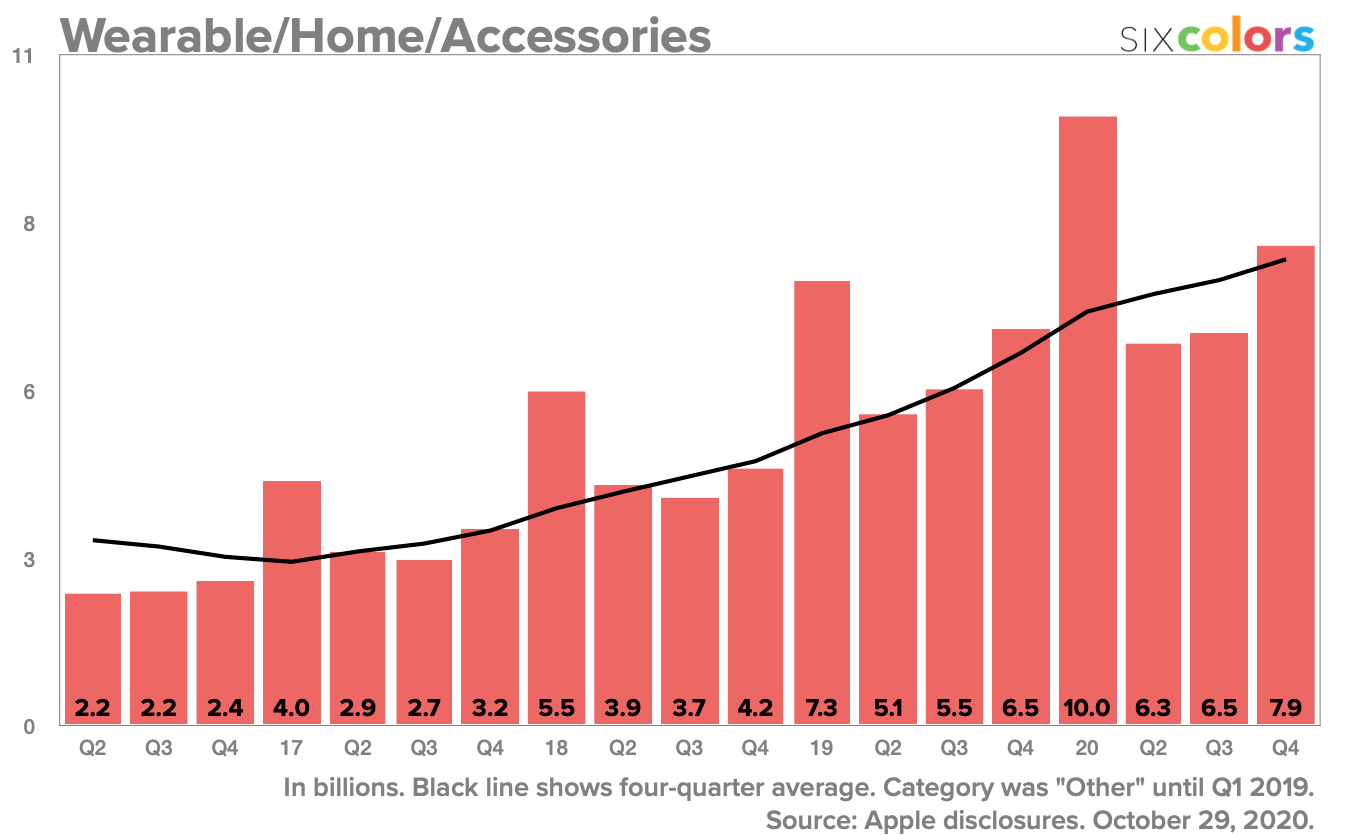 第二是IoT设备的潜力,熟悉苹果财报的同学都知道,苹果的可穿戴业务是近几年每次都能稳定上涨的良性资产,这次也不例外,涨幅达到了21%。近期苹果频频发布廉价新款产品(如Apple Watch SE、HonePod mini),恐怕也是为了将表现良好的IoT业务进一步扩大。