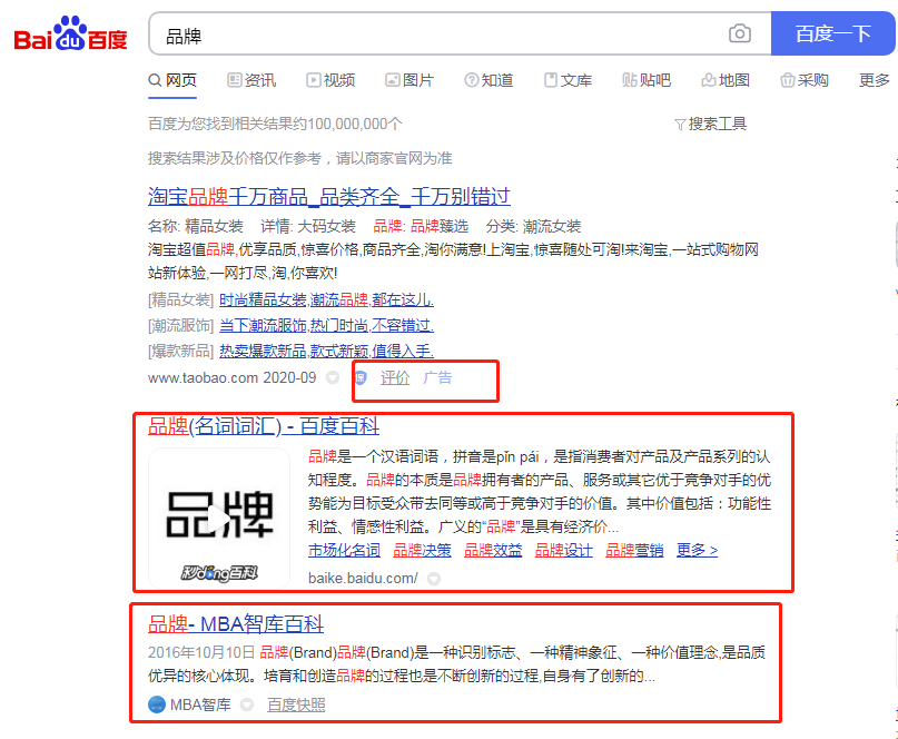 以百度为例,搜索“品牌”关键词,展示页面中标有广告的为SEM,而标有百度快照或者百度旗下产品(百度百科、百度知道、百度贴吧等)则为SEO。