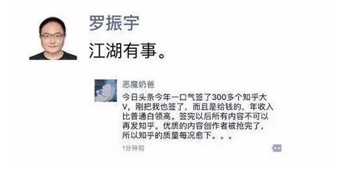 那就是今日头条从知乎平台签下了300个高质量的大V,而且签约费比普通的白领要高,签署的协议中规定这些大V们以后不允许在知乎等问答平台输出知识问答,并且每个月要有一定数量的回答,有字数的限定。