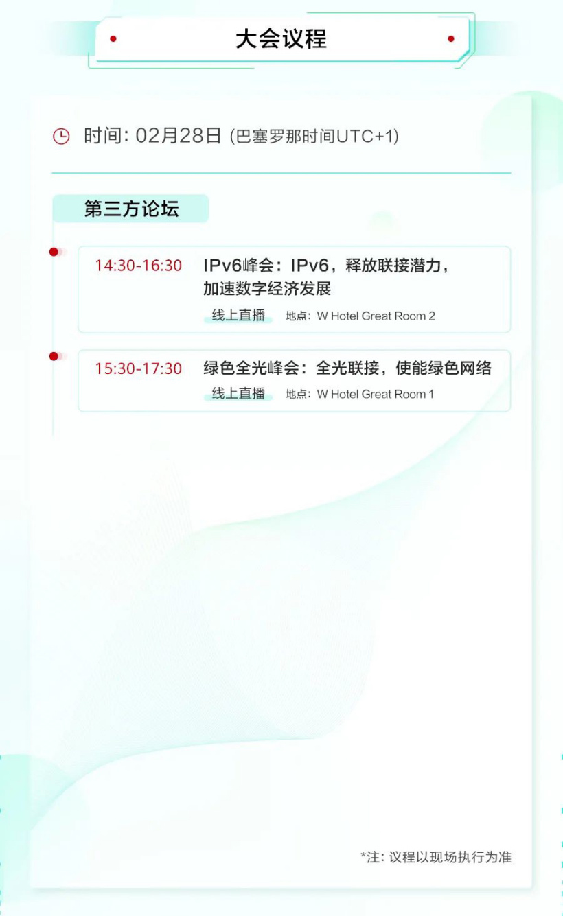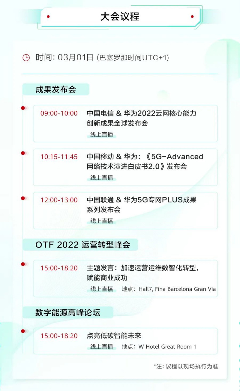 另外华为公司也公布了 MWC 2022 会议议程,2 月 28 日-3 月 3 日开启。包括 IPv6 峰会、绿色全光峰会、中国电信 & 华为 2022 云网核心能力成果发布会、中国移动 & 华为《5G-Advanced 网络技术演进白皮书 2.0》发布会、中国联通 & 华为 5G 专网 PLUS 成果系列发布会等。