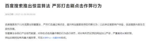 “惊雷算法”旨在严厉打击通过刷点击提升网站搜索排序的作弊行为;对于网站存在点击浏览,流量作弊的行为进行惩罚;另对有判罚记录的网站加以严惩,严重者将长期封禁。如网站在此期间有流量大幅异常,可在反馈中心—流量异常投诉。