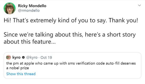 这位名叫Ricky Mondello的苹果软件工程师曾参与过“安全码自动填充”功能的研发,她表示为新系统加入“安全码自动填充”的想法实际上是偶然间出现的,起初团队也都十分认可这一功能不过由于当时手头还有优先级更高的项目需要完成,于是这个点子被暂时搁置了。换句话说“密码自动填充功能”并不是软件团队最初便计划好要做的,它最初只是团队在设计一些非常不同的东西时所产生的一个“小主意”。整个过程完全可以被形容成“无心插柳柳成荫”。