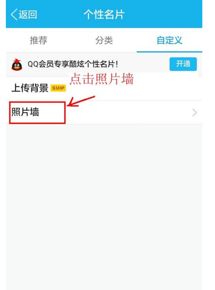 站长新闻 您的位置:老客外链 > 站长新闻 > 软件 > qq照片墙8张照片怎么设置 文章来源:未知 作者:老客SEO 人气:14 2019-11-26 11:39:58 工具原料;手机,QQ 首先登录自己的QQ然后右滑 点击自己的头像 然后在个人资料里选择个性名片 之后在个性名片里选择自定义 然后再选择照片墙 然后再点击虚线框 然后就添加8张图片,然后再打开拼图效果自己调节排列方式,最后再点击使用 上一篇:手机qq照片墙在哪里? 下一篇:现在qq怎么设置照片墙 相关文章 Office 2010 Toolkit怎么用 文章来源:老铁商城2019-10-11 office怎么安装 文章来源:老铁商城2019-10-11 office2007文件格式兼容包 文章来源:老铁商城2019-10-11 新浪微博怎么加好友 文章来源:老铁商城2019-10-11 新设备登陆微信如何跳过手机验证 文章来源:老铁商城2019-10-11 怎么在微信提示音里设置自定义铃声? 文章来源:老铁商城2019-10-11 一个手机号怎么注册两个微信号 文章来源:老铁商城2019-10-11