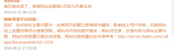小编建议,在网站整改完成后,进行快照投诉和向百度站长工具反馈,加快恢复时间。如下图小编负责的其中一个网站所反馈的信息。