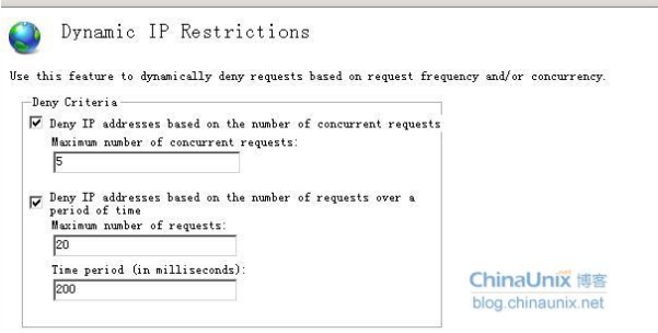 勾选启用,并设置日志文件的保存路径。下面的数字表示跟踪的次数(跟踪一次会生成一个日志文件)。然后进入失败请求跟踪规则的设置界面,单击添加,安照向导一步一步设置即可。生成的日志文件为.xml格式,可通过浏览器查看。IIS6没有此功能。压缩IIS7中的压缩功能包含静态内容压缩和动态内容压缩,是指先将页面内容压缩后再返回给浏览器(当浏览器发起GET请求时)。启用此功能,可以节省带宽,提高访问速度(相当不错的功能...)。只是动态内容压缩会加大系统开销,不建议使用,静态内容压缩是默认开启的。IIS6没有此功能。DynamicIPRestrictions动态IP限制,一个类似DDOS防火墙的功能!进入DynamicIPRestrictions设置界面,可以看到,不仅针对并发连接数进行限制,还可以针对一段时间内,某IP的访问次数进行限制: