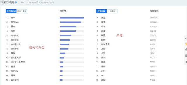 上面两张图是百度指数需求图谱功能的具体体现,我们可以通过上图分析用户搜索seo最想知道什么,以及搜索seo这个关键词是想得到什么什么服务。作为一名seo,我们要经常用到这个功能来挖掘用户需求,以及挖掘长尾关键词。