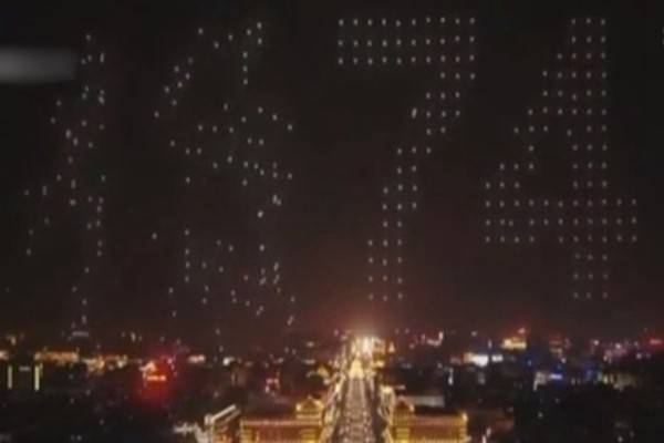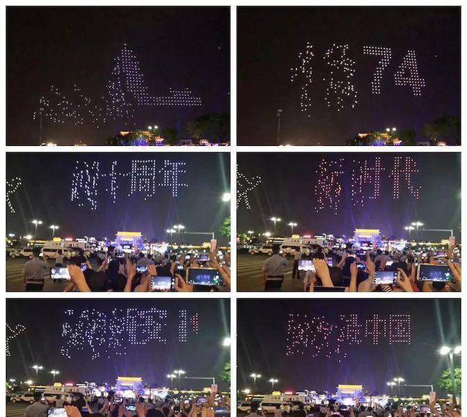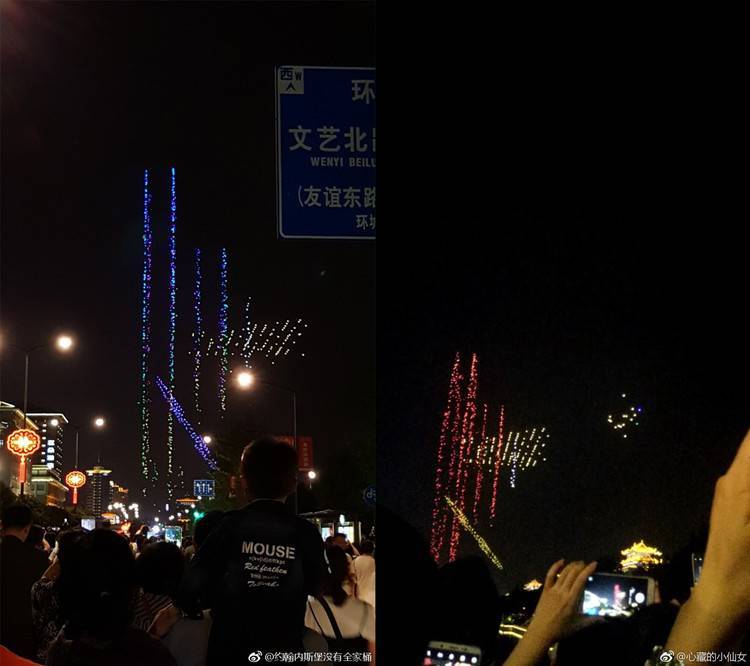 在当晚的正式表演当中,1374 架无人机并没有成功组成完整图案。演出的一开始就有一部分无人机没有飞到预定位置,导致局部不成图案,以下图片来自网友以及部分电视频道画面,网友称之为“乱码”……