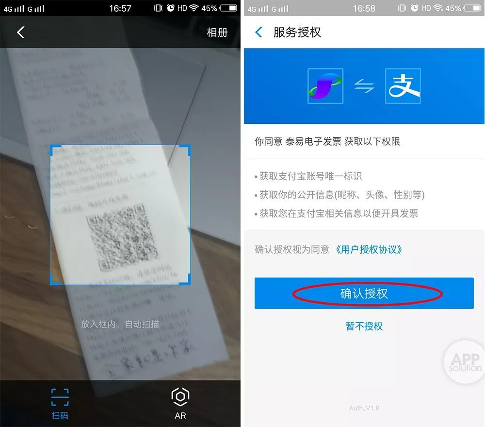 打开支付宝「扫一扫」,对准购物小票上的二维码,就会跳转到开发票需要的服务商,此时选择「确认授权」。