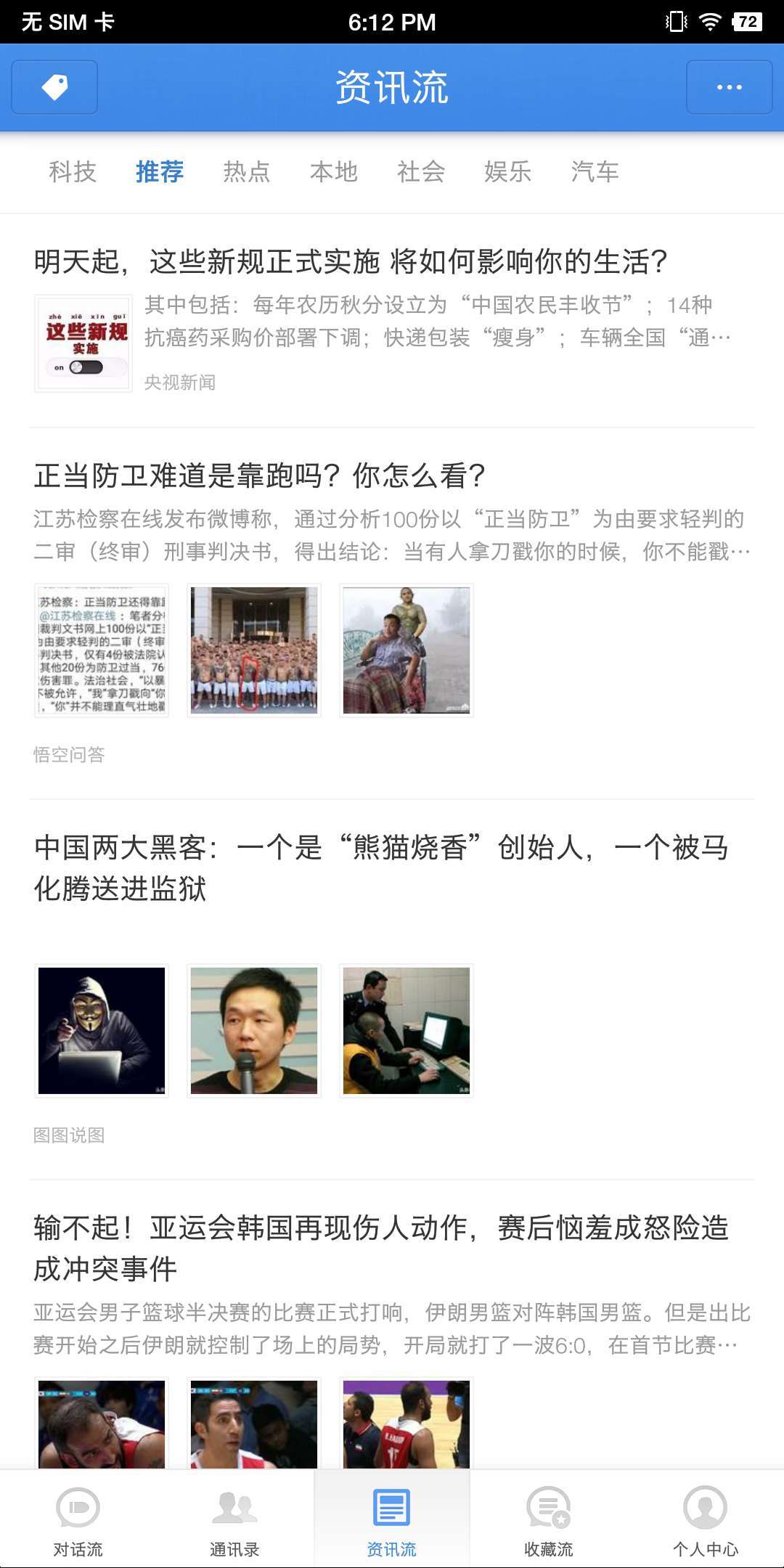 子弹短信的功能比微信少得多,但底部的版块却要多一个。子弹短信没有发现,却多了资讯流和收藏流。