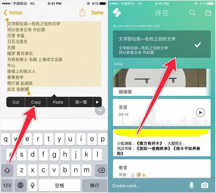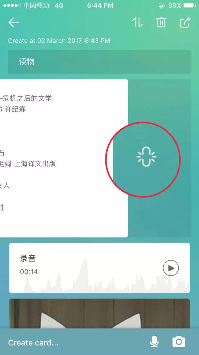 点击「create card」,在弹出的空白区域输入你的日程安排或其他你想记录的东西,输入后,文字卡便自动生成,此功能和以往曾用过的笔记类工具并无太多差别,在此无需赘言。这里需要强调的是,当需要复制一部分此界面以外的文本内容作为重点保留时,该应用提供「即时复制即时保存」功能,自动生成复制信息卡,减少了「复制」和「粘贴」来回转换过程中不太必要的程序。