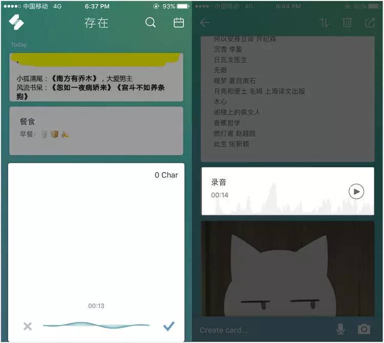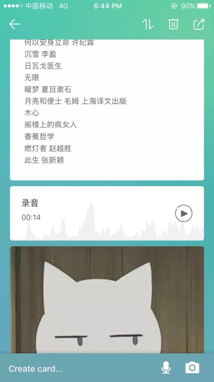 就拿采访这项工作来进行假设,一次采访所需有采访人姓名、联系方式、具体地址等文本内容生成的文字卡片,采访过程的现场同期声的声音卡片,以及合影留念什么的生成为图片卡,如此,太过凌乱不助于有效整理,那么一个文并图并声的卡组的建立真是省事儿。
