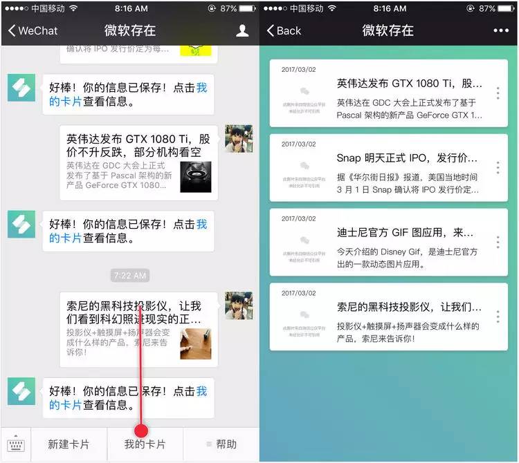 其次,关注「存在」的微信公众号,保存至公众号的信息可直接存入 App「存在」中,无需切换,具体来讲,在微信公众号当中的所有操作,都将自动同步到「存在」界面并保存,这是其一,除此以外,将自己感兴趣想要留存下来的文章发送给应用公众号,文章会被自动生成卡片并保存,也可关注官方公众号「微软存在」,使用「微软存在」建立链接卡,将微信文章发送到服务号。