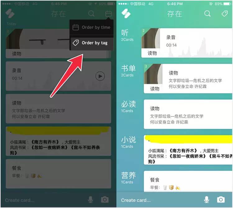 标签查找同样可以用两种方法完成,位于主界面右上方的「放大镜」搜索,或是选择卡片排列以「标签」为序,更直观的查找到某标签下的卡片。