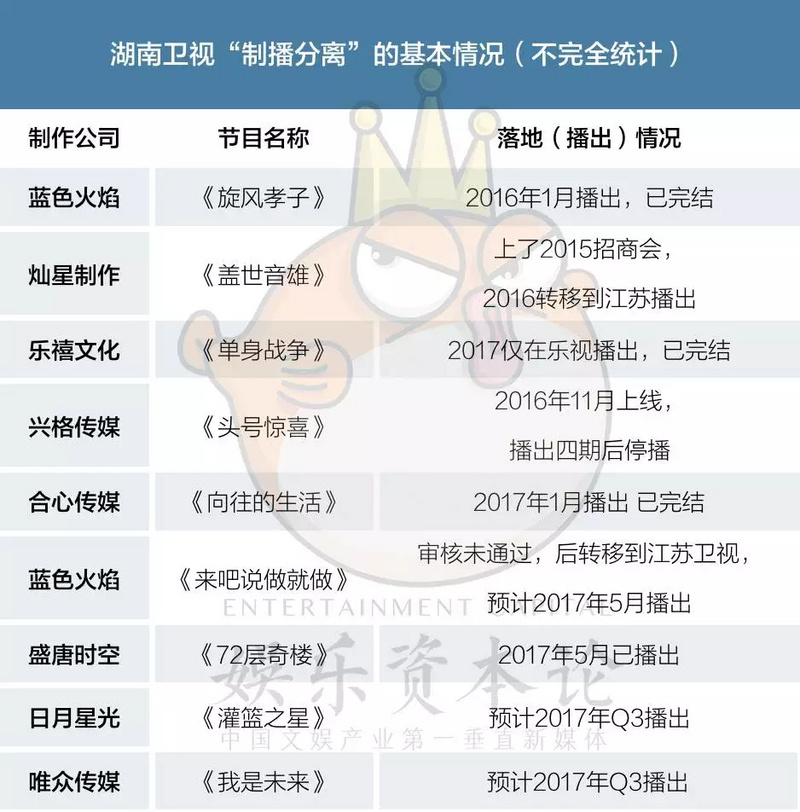 联想到之前本要与之合作、换了平台或无疾而终的《盖世音雄》、《单身战争》、《来吧说做就做》,以及在湖南卫视播出几期就腰斩的《头号惊喜》,湖南卫视的“制播分离”节目为何总是命运多舛?