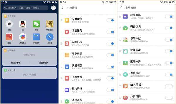 长按home键或在桌面上滑即可呼出,类似iOS 11的卡片形式整合了16个应用场景:待办事项、通勤路况、运动计步、场景服务、停车导航、外卖订餐、快递动态等功能。基于Ome Mind的AI智能分析能力,个人助理可以更全面、及时和精准地满足用户需要。
