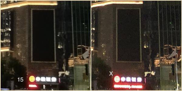 由样张可以看出,15夜景成像大幅提升了亮度(据我实际观察超过了肉眼所见实际亮度),暗部没有太多明显的噪点,但锐度不如X,噪点控制15略好于X。注意看楼顶的霓虹灯字、放大后的玻璃门以及万达的logo,15的炫光控制和X差不多,1.55微米大底立竿见影。2倍变焦下夜晚弱光无法激活无损变焦的副摄像头,所以不做比较。