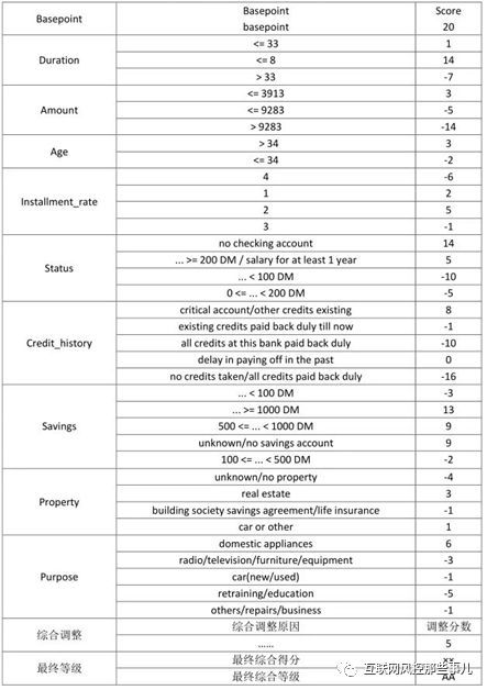 评分卡模型是分类模型中的一种特殊表现形式,我们直观看到的评分卡大概是类似于以下图表的,即不同的x变量会给与不同的分数,比如年龄在一定区间内的加m分,在另外一个区间给n分,看着是很随意,但是实际不然。