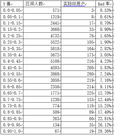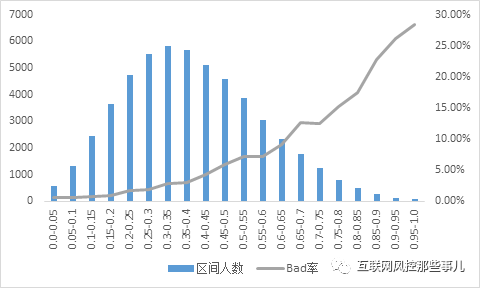 模型跑出来的“Y”值为每个客户的预测违约概率,可以理解为客户的有多大的可能违约。把Y等分分段,通过每分段内的区间人数和实际坏用户的标签进行比对,可以得到下述图表。