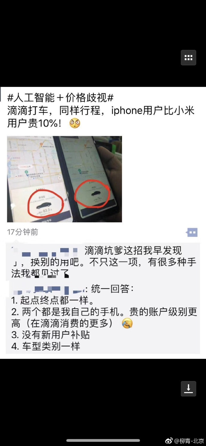 近日,有用户反映称滴滴打车,同样的行程,iPhone用户比小米用户贵10%。同时,他表示,测试的两款手机设置的起点和终点都一样,车型类型一样,也没有新用户补贴,但是费用贵的账户级别更高。