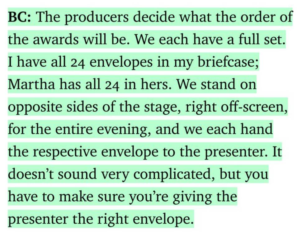 Cullian在另一个采访中,也对Medium表示,他和Martha会站在舞台的两侧,各自把信封给到正确的人手中。不少好莱坞人士分析,乌龙事件的发生可能因为颁奖嘉宾分别由两侧上台,其中一个人拿到了上一个奖项的信封。
