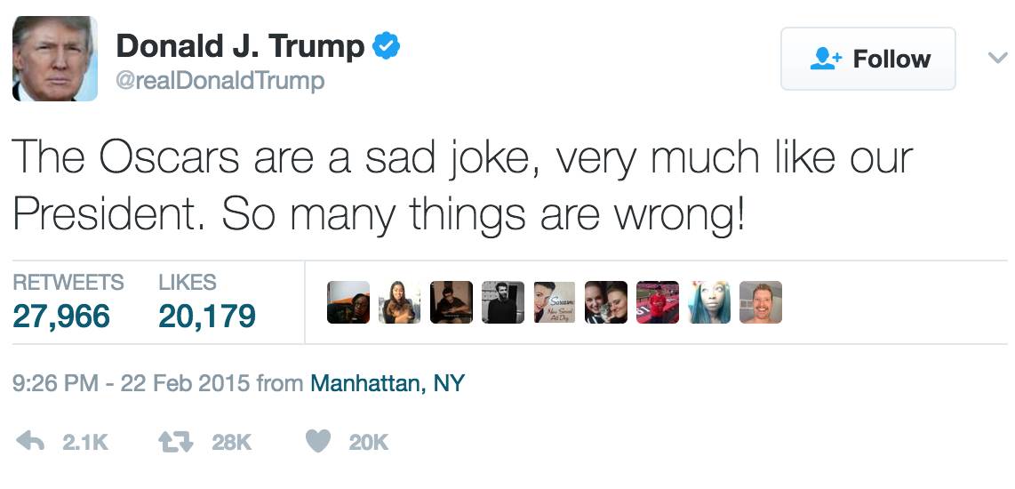 2015年2月2日,特朗普Twitter写道,“奥斯卡就是一个悲伤的笑话,就像我们的总统。很多事情都错了”。#让你们怼我