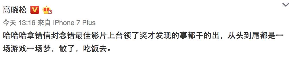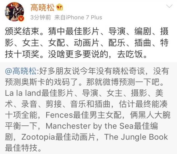 高晓松一早就预测本届奥斯卡“最佳影片”会花落《爱乐之城》,颁奖乌龙时还手快地发了微博,“猜中最佳影片......没啥更多要说的,去吃饭。”#目前该微博已删除