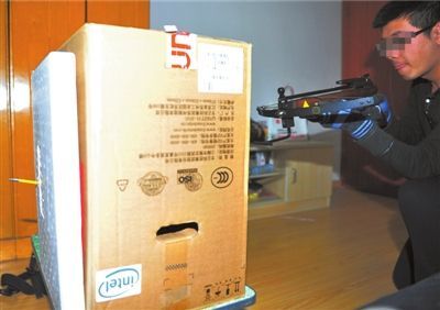 记者试验时,弩箭射穿两层泡沫板。本报记者陶冉摄