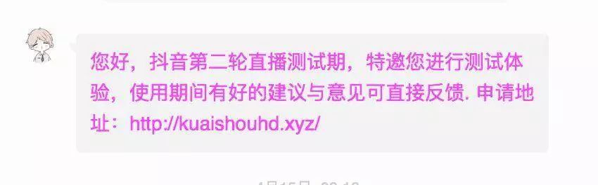 那天是我玩抖音的第30天,刚好一个月。上午大概9点多,收到一条抖音私信,我看了一下是个加V的官方账号,私信的意思大概是:你最近的内容质量很好,活跃度很高,官方邀请你成为第二轮直播内侧用户。让我加他QQ。