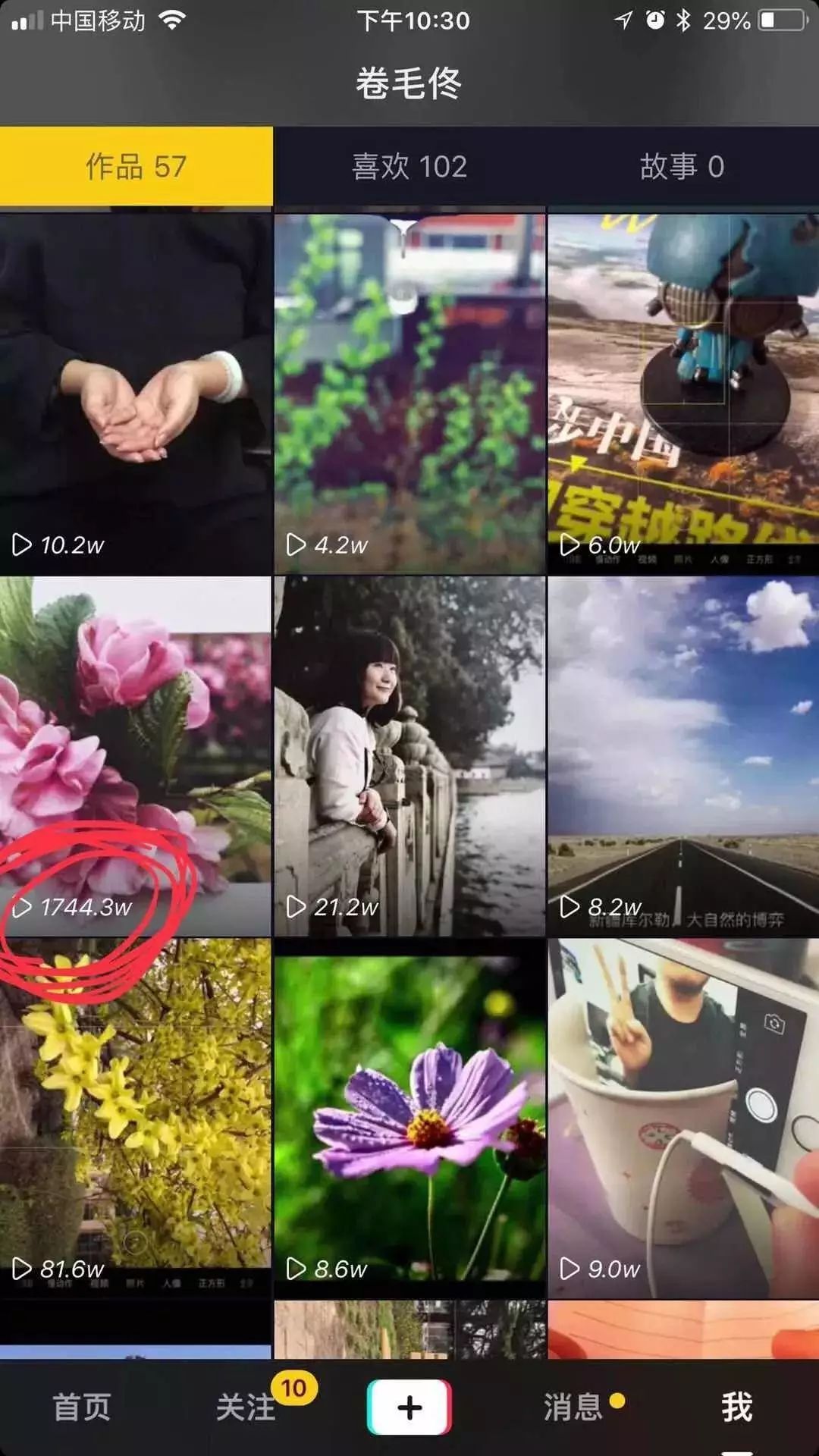 我立马注册了一个叫做“卷毛佟”的账号,选了我自己做的图片做头像,签名是:手机摄影师,教你手机拍出好照片。经过一天的准备,我的第一个15秒短视频上线了,令我沮丧的是,一天时间,只有几十个人观看。