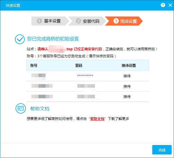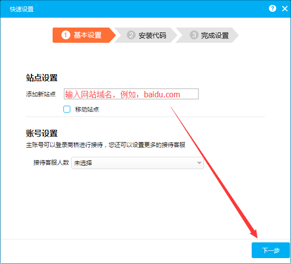 3.在“站点设置”中输入网站域名,设置接待客服的数量,再点击下一步