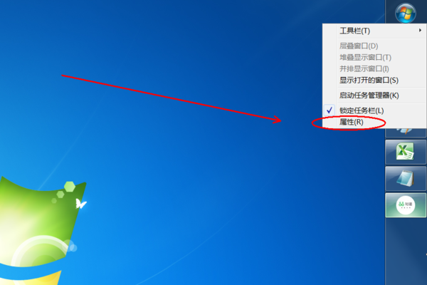 1、在任务栏任意位置点击鼠标右键,并在右键菜单中点击选择“属性”。