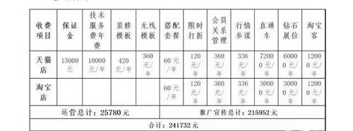 但是事情不是这么发展的,eBay的老板错了。淘宝一统江湖后,开启流量变现模式,淘宝天猫卖家们需要付出的包括技术服务费、装修模板费、会员关系管理费等9种费用(保证金和淘宝客费用除外),淘宝卖家相对要少一些。但要让店铺保证一定的营业额,一年的运营宣传费用超过20万元(天猫、淘宝各开一家店)是小意思,详见下图。