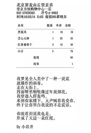 情人节的时候,我们在小票上印上了爱的故事。任何买面包的人都会在门店得到这样一张长长的小票,故事都是随机的。