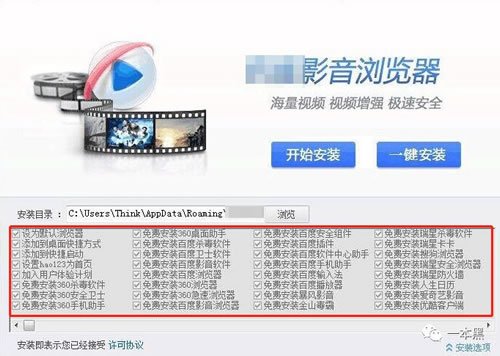 除此之外,软件捆绑还有两种方式,第一是广告主直接跟官方谈合作,将软件插在默认的官方安装包中,当用户在安装官方包时,会默认勾选其它软件。