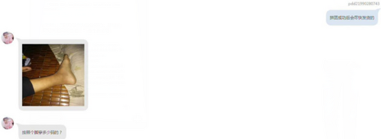 (下图)我们遇到的一个奇葩客户,不知道穿多少码,直接拍照发过来,这样的类似的客户很多,这也从侧面印证的拼多多的客户多数是网购新用户。
