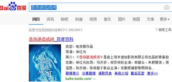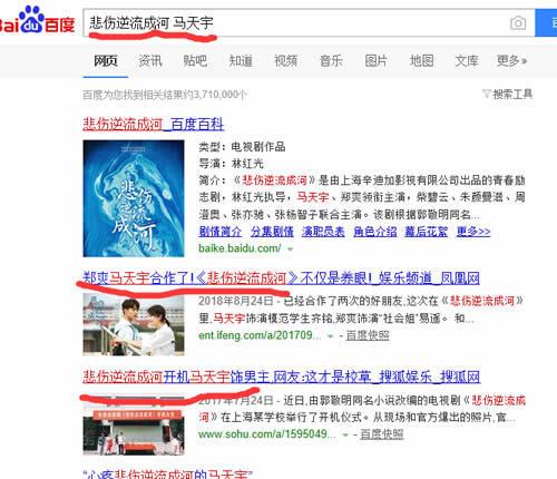 这个操作很简单,我们只需要把“悲伤逆流成河”这个关键词,通过百度搜索就可以找到这部电影的百度百科介绍。在这里我们可以清晰的看出,有关这部电影相关的演员有马天宇,郑爽等。