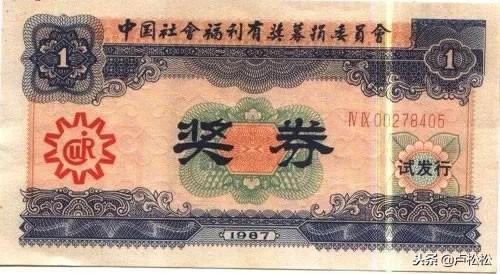 1987年发行的“中国社会福利有奖募捐券”,长得像1块钱人民币,背面写着“利国利民”。