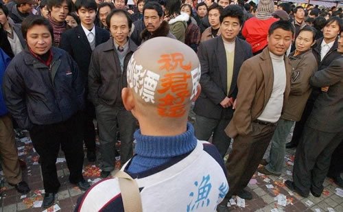 2003年新年第一天,在杭州市广场上,一个光头男子走进了彩民的视线,头上画着福利彩票的广告。