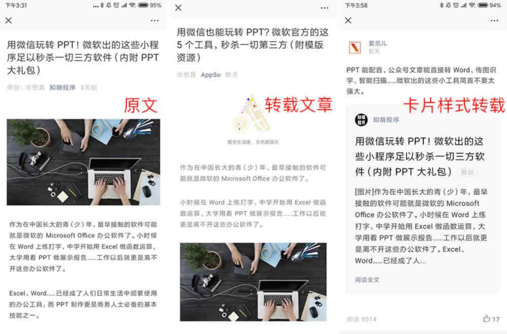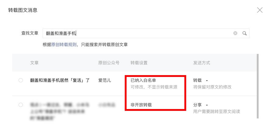 白名单成了判断公众号能否转载文章的唯一标准。如果公众号在白名单内,则可以直接转载文章,如果不在白名单内,转载文章则会变为自动分享卡片样式或原文样式。