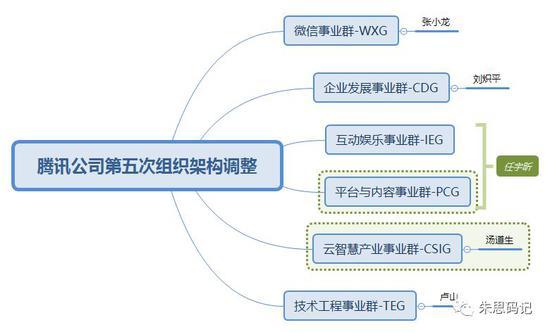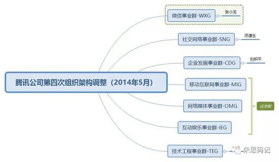 ●人事安排上,出现的第一张新面孔是2005年加入腾讯后帮助QQ空间完成0-1起飞的汤道生,他于2012年开始掌管SNG事业群;5年后已成为游戏之王的任宇昕,独掌三大事业IEG,OMG,MIG;TEG方面,前期由腾讯创始人之一的CTO张志东继续担当,后期因为健康方面的原因于张志东于2014年3月19日宣布离职后,由卢山接棒。