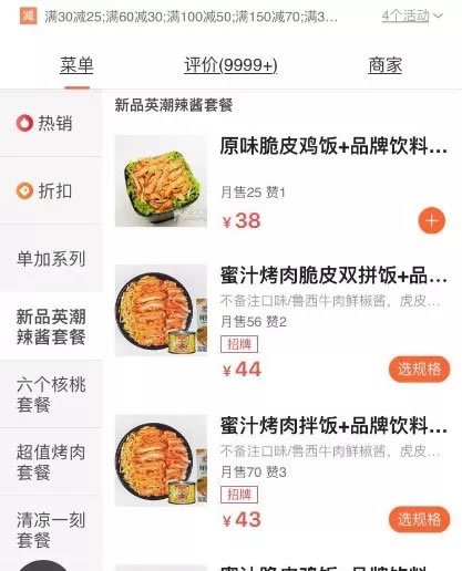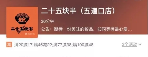 我们还会看到的满减档有“100减35”、“130减50”等,通常在商铺的第3、4、5档处,满减的门槛很高,起步就超百,这个档位针对的是2人及以上的多人食场景设计。