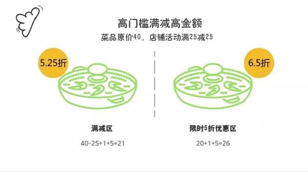 如满25减25,一般商家会把主推餐品设置成两个价格,一个为原价,一个为限时5折的活动价,顾客购买原价餐品和活动餐品费用相差不大,商家仍有利润空间。