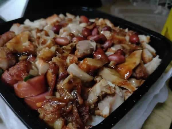 是的 ,今天中午又点外卖了,依旧是我最爱的33元烤肉双拼饭,半肥瘦叉烧搭配煎炸过的火腿,犹如鳗鱼汁的拌饭酱浸入软糯的米饭中,酥脆的花生米作为点睛之笔,妙哉妙哉!