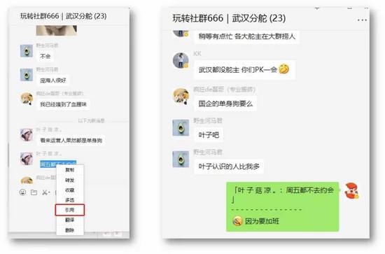 17、微信群要回复某人单条信息,微信pc电脑端,右键点击某条聊天,可引用该聊天进行回复