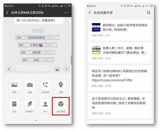 21、如何快速将图片、文字、链接发送到各个群?先将图文、文字、链接收藏到收藏夹,然后打开一个群,点“+”,出现“我的收藏”,选择你要发的内容,就可以把你要发的信息如你的银行账号、收发货地址等信息快速发出去了,相当于快捷回复,非常方便。