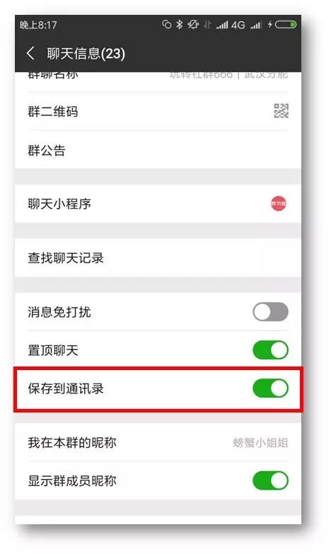 24、要避免群再次失踪,可进入群,点击右上角的人形图标,拉到下面,找到“保存到通讯录”,就可以在通讯录——群聊里面找到你要的群;没有保存的群,在重装微信或者更换手机后都会消失。