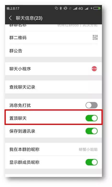 15、进入群,点击右上角,往下拉找到“置顶聊天”打开按钮,本群置顶。就可快速找到经常要看的群。