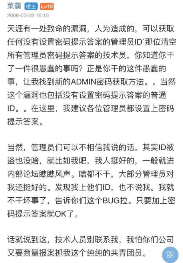 无聊的时候就登陆管理员的账号,和天涯内部的高管们进行友好交流,阔绰地送网友上亿积分。天涯IT部门的精英们被菜霸耍的团团转,却又无可奈何,除了关掉自己的服务器,他们没有任何办法阻止菜霸的入侵。但菜霸在入侵后,也没有做进一步过分的举动,甚至还发帖指出天涯的漏洞,并且提出了解决方案。